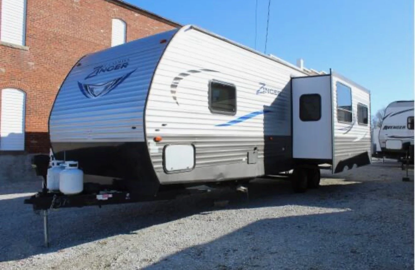 This single slide unit is similar to the Kingsport 279BH. It has a queen bed in the master, a twin and two bunks in the 2nd bedroom. The booth dinette makes into a nice sleeping area as well. Unit is 36/8” in length.